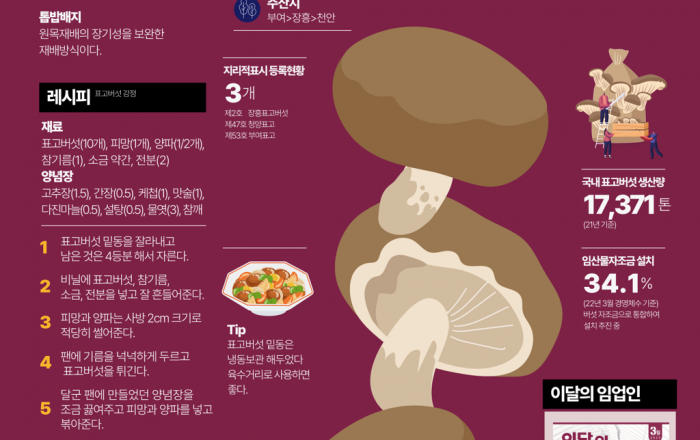 산림청은 매월 대표 임산물의 효능과 효과, 조리법 등을 소개하여 임산물의 우수성을 알리고 올바른 임산물 구매를 안내하기 위해 ‘이달의 임산물’ 시리즈를 추진하고 있다. ‘이달의 임산물’ 시리즈는 산림청 블로그에서 만나 볼 수 있다.