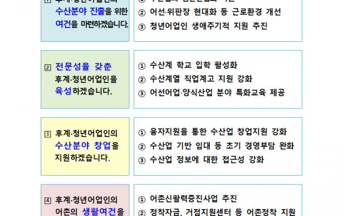 정부가 수산업의 미래성장산업화를 이끄는 후계·청년어업인들이 수산분야에 진출할 수 있도록 근로환경 개선을 포함해 수산업경영인 육성자금 지원규모 확대 등을 추진, 어업인후계자 3500명·청년어선원 600명 육성에 나선다. 해양수산부는 어촌 인구 감소와 고령화 현상을