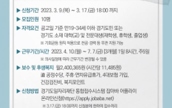 경기도의회는 다양한 직무 경험과 진로 탐색 기회를 제공하고 취업 및 역량 강화를 통한 청년 실업문제 해소에 일조하기 위해 청년행정인턴을 모집한다. 이번 청년행정인턴은 공고일 기준 만 19세부터 34세까지의 경기도에 거주하는 청년이면 경력·자격 무관하게 누구나 신청할