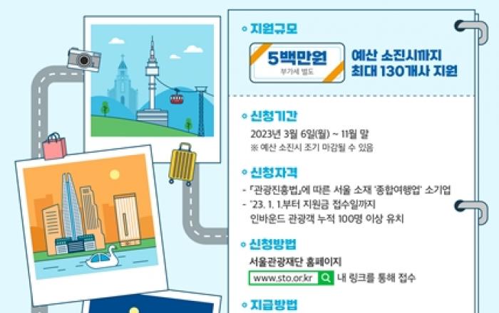서울시, 외래관광객 유치 여행사에 고용지원금 500만원 지원 서울시가 코로나19 엔데믹을 맞아 국제관광 재개에 대비하는 인바운드(외국인의 국내여행) 여행사를 대상으로 고용지원금을 지급한다고 밝혔다. 지원금은 서울 소재 종합여행업 소기업 최대 130개 사를