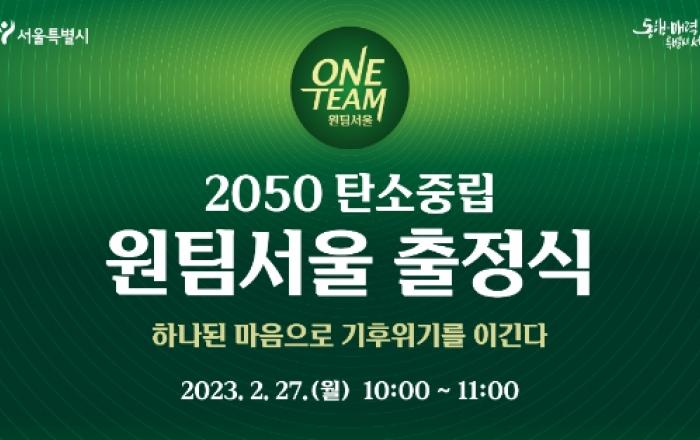 '원팀, 서울'출정식 메인 화면 서울시는 2월 27일(월) 9시 50분 서울시청 8층 다목적홀에서 25개 자치구, 서울시의회, 서울시 및 자치구 탄소중립녹색성장위원회, 시민 등 300여 명과 함께 기후위기 대응과 탄소중립 달성을 위한 ‘원팀’ 출정식을 개