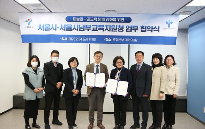 (왼쪽 4번째-최경주 서울시 문화본부장, 왼쪽 5번째-주소연 남부교육지원청 교육지원국장) 서울시는 '서서울미술관'의 개관(’24년 11월)에 앞서 서남권 청소년들의 미술특화 예술교육을 위해 서울시남부교육지원청과 업무협약을 체결했다. 협약식은 2월 2