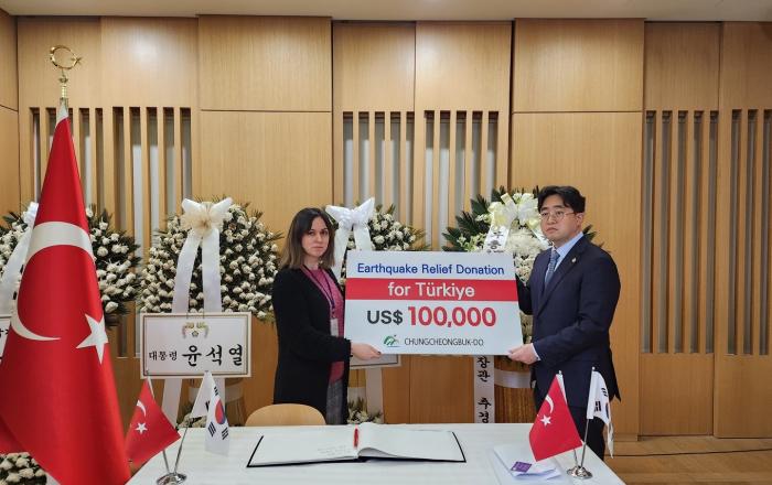 충청북도는 23일 주한튀르키예대사관에서 김명규 경제부지사와 주한튀르키예 2등 서기관이 참석한 가운데 튀르키예 지진 피해 구호금 기탁식을 가졌다. 대사관을 방문한 김 부지사는 애도와 위로의 마음을 담아 방명록을 작성하고, 지진 피해를 신속히 지원하기 위해 편성한 예비