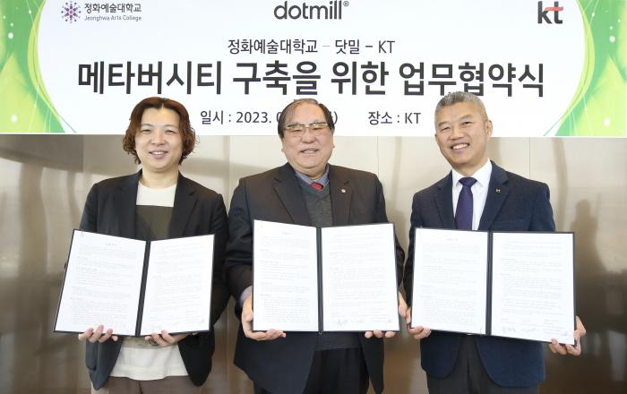 KT 강북강원광역본부가 실감 미디어 전문 업체 닷밀, 정화예술대학교와 함께 ‘메타버시티(Metaversity)’ 구축을 위한 업무협약을 체결했다고 20일 밝혔다. 이번 업무협약으로 3자는 정화예술대학교에 실감미디어를 적용한 디지털 트윈 ‘메타버시티’