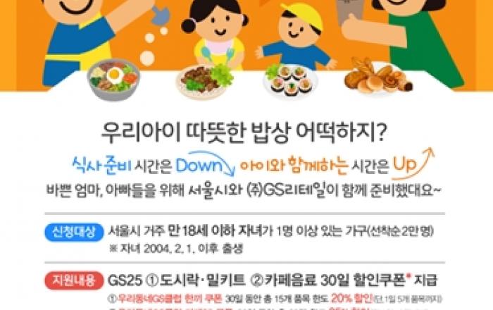 서울시, `퇴근길 가정행복 도시락·밀키트 할인쿠폰` 신청하세요...선착순 2만 명 서울시 ‘퇴근길 가정행복 도시락・밀키트 할인지원’ 사업’은'엄마아빠 행복프로젝트'의 하나로, 엄마아빠가 퇴근 후 아이와 더 많은 시간을 보내도록 도시락, 밀키트 등을 20
