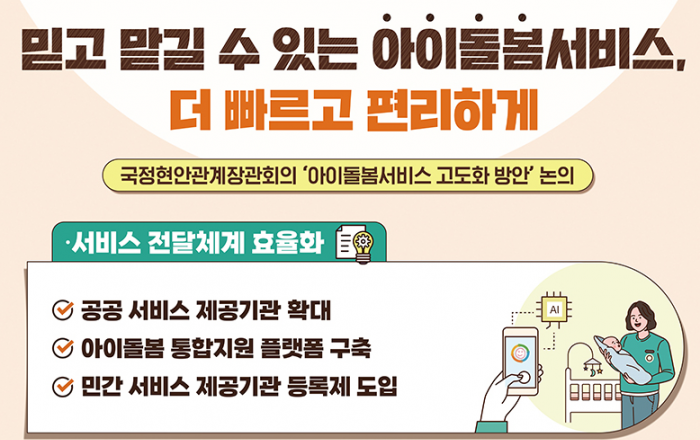 정부가 믿고 맡길 수 있는 아이돌봄서비스를 더 빠르고 편리하게 이용할 수 있도록 인공지능 시스템을 활용한 ‘아이돌봄 통합지원 플랫폼’을 구축한다. 돌봄인력의 전문성을 높이기 위해 돌봄인력 국가자격제도를 도입하는 한편, 긴급 출장 등 돌봄 수요 대응을 위한 단시간 및 긴