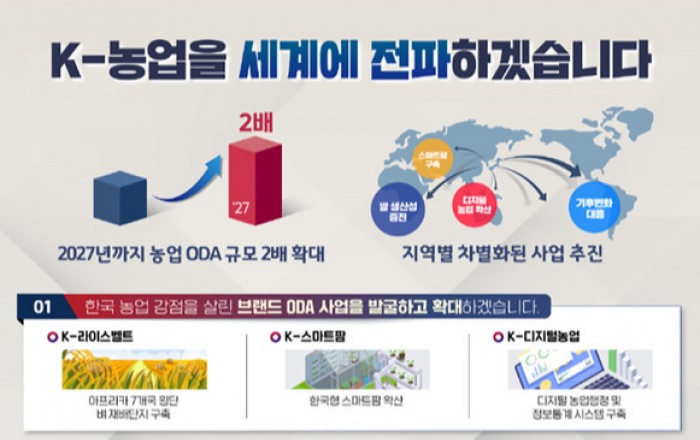 정부가 농업 공적개발원조(ODA) 규모를 오는 2027년까지 2배로 확대하는 등 전세계 식량·기후위기 극복을 위해 케이(K)-농업 전파에 나선다. 외교부에 따르면 정부는 지난 10일 박진 외교부 장관 주재로 제5차 ‘무상개발협력전략회의’를 개최해 ‘농업 분야 공적