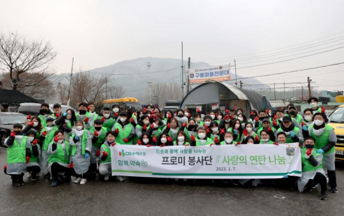 DB손해보험은 2023년 첫 사회공헌활동으로 7일 서울시 강남구 구룡마을 일대에 따뜻한 겨울나기를 돕기 위한 사랑의 연탄 1만장을 후원하고, 그 중 2000장의 연탄을 80여명의 임직원과 가족들이 직접 배달하는 봉사를 실시했다고 9일 밝혔다.사랑의 연탄나눔 봉사는 DB