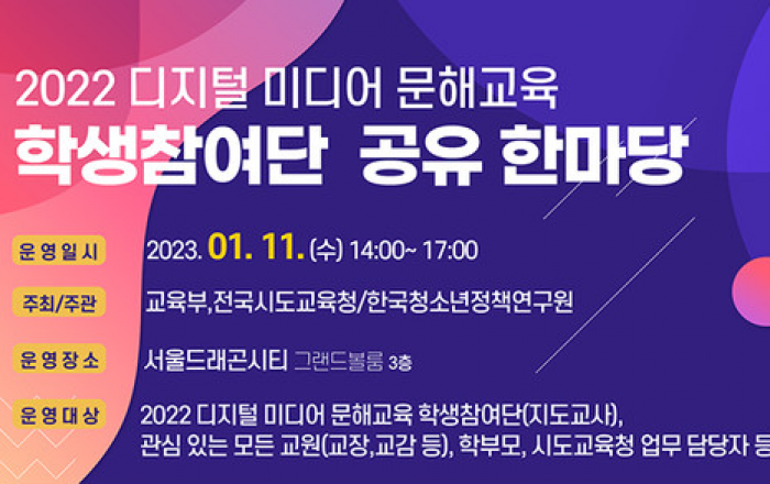 교육부와 한국청소년정책연구원은 오는 11일 서울드래곤시티에서 ’디지털 미디어 문해교육 학생참여단 성과공유 한마당’(이하 성과공유 한마당)을 개최한다고 10일 밝혔다. 이번 성과공유 한마당은 디지털 미디어 문해력 함양 활동을 수행한 학생참여단 각 팀별 활동 경험과