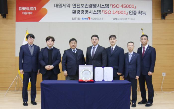 대원제약은 자사의 생산 시설인 향남공장과 진천공장이 환경경영시스템(ISO 14001)과 안전보건경영시스템(ISO 45001) 국제 표준 인증을 받았다고 11일 밝혔다.이날 대원제약 향남공장 강당에서 열린 인증서 전달식에는 대원제약 백인환 사장, 생산부문장 손세일 전무