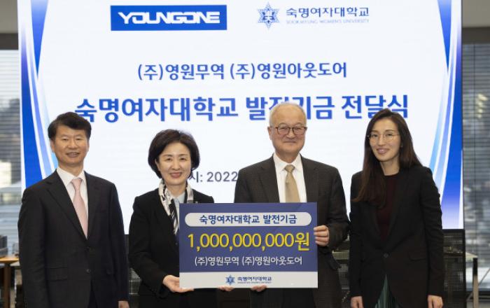 영원무역과 영원아웃도어가 숙명여자대학교에 산학연 발전기금 10억원을 기부했다.영원무역과 영원아웃도어는 23일 오후 서울 중구 영원무역 명동 빌딩에서 성기학 회장·성래은 부회장 및 숙명여대 장윤금 총장·박종성 부총장 등 양측 관계자가 참여한 가운데 산학연 발전기금 전달식