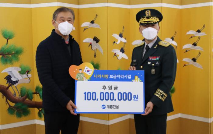 계룡건설 한승구 회장은 12월 20일 충남 계룡시에 위치한 육군본부를 방문해 고태남 인사사령관(소장)에게 ‘나라사랑 보금자리’ 사업 후원금 1억원을 전달했다.‘나라사랑 보금자리’ 사업은 어려운 환경에 있는 6·25 및 월남전 참전 유공자들의 주거환경을 개선하기 위해 육