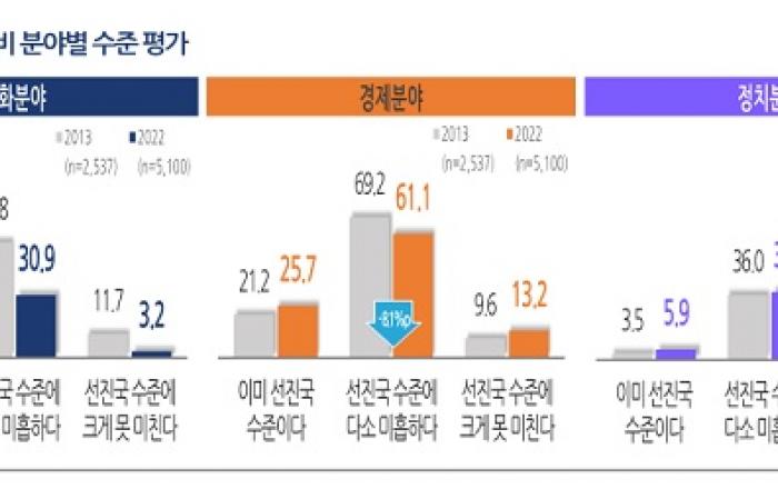 우리나라 국민의 약 66%는 한국 문화는 이미 선진국 수준이라고 여기고 있는 것으로 나타났다. 우선 해결해야 할 과제는 ‘일자리’라고 답했으며, ‘경제적으로 부유한 나라’를 가장 희망하는 것으로 조사됐다. 문화체육관광부는 19일 (주)한국갤럽조사연