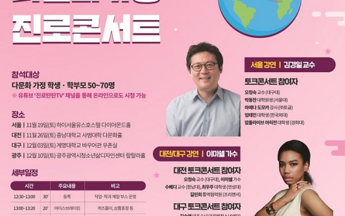 다문화가정의 진로고민 해결을 위해 전문가, 선배와 함께 진로 개척과 성장 경험을 나누는 ‘찾아가는 다문화가정 진로콘서트’가 권역별로 4회 개최된다. 교육부는 한국청소년정책연구원 및 시도교육청 17곳과 함께 ‘찾아가는 다문화가정 진로콘서트’를 개최한다고 18일 밝혔
