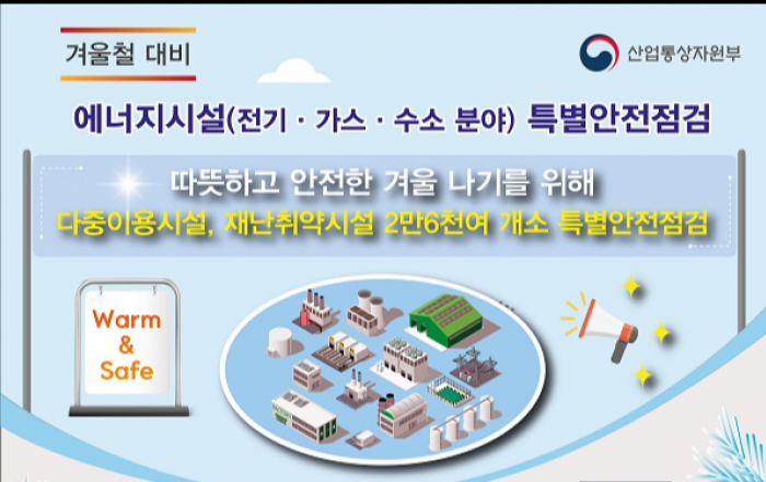 산업통상자원부는 대규모 점포, 사회복지시설 등 2만6000여 곳을 대상으로 내년 2월까지 3개월 동안 전기·가스·수소 분야 특별점검을 한다고 17일 밝혔다. 이번 특별점검은 겨울철 이상 한파와 폭설 등 계절적 요인에 따른 에너지 시설의 안전사고 및 인명피해를 사전