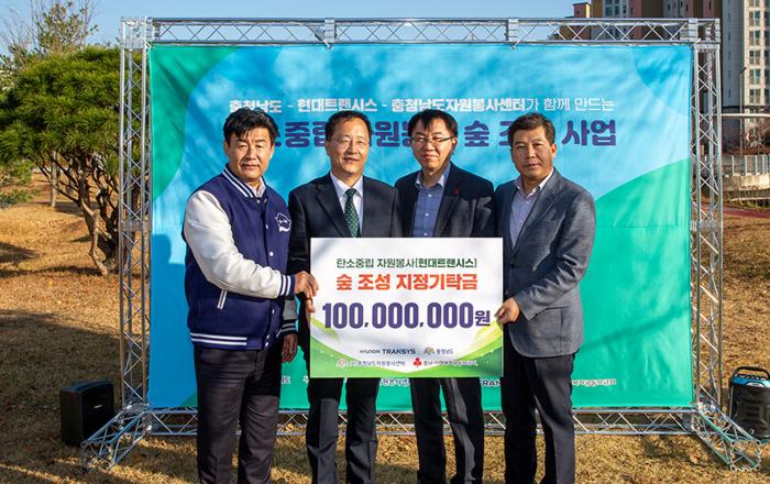 현대트랜시스가 임직원의 자발적 걸음 기부를 통해 “탄소중립 자원봉사 숲” 조성에 나섰다.현대트랜시스는 지난 11월 16일 충남 홍성군 홍예공원에서 충청남도, 충청남도자원봉사센터와 함께 탄소중립 숲 조성을 위한 업무협약을 체결하고 기념 식수, 표지석 제막식 행사를 진행했