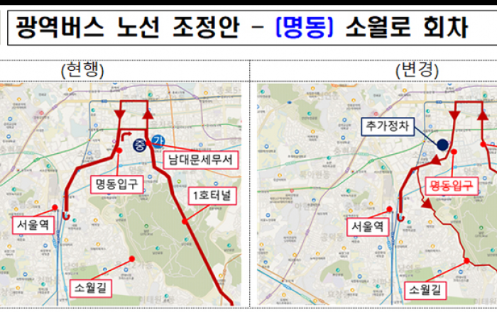 정부가 명동, 강남에서의 광역버스 정류장 혼잡과 상습 정체를 해소하기 위해 명동 방향 13개, 강남 방향 20개 광역버스 노선의 운행 경로를 조정한다. 국토교통부 대도시권광역교통위원회와 서울특별시, 인천광역시, 경기도는 명동, 강남 등 서울 주요 도심의 도로와 버