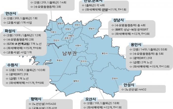 정부는 광역버스 등을 이용한 서울 출퇴근 인구가 많은 수원 등 경기 남부지역의 대중교통을 대폭 확충하기로 했다. 이에 2층 전기버스 등의 광역버스를 늘리고, 출퇴근 전세버스와 급행버스, 광역 수요응답형 버스(DRT) 등을 도입한다. 또 경기도와 협의해 시간제 버스