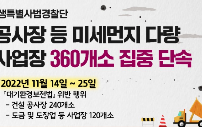경기도 특별사법경찰단이 11월 미세먼지 집중 관리 시기를 맞아 오는 14일부터 25일까지 도내 미세먼지 배출사업장의 불법행위를 집중 단속한다.단속 대상은 건설공사장을 중심으로 날림(비산)먼지가 다량 발생하는 공사장 240개소, 초미세먼지 2차 생성에 영향을 미치는 휘발