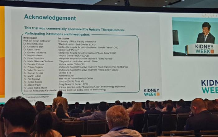 난치성 항암치료제 및 당뇨합병증 치료제 개발 기업 압타바이오가 미국 플로리다 올란도에서 열린 미국 신장학회 연례 미팅에서 아이수지낙시브(당뇨병성 신증 치료제) 2상 임상 결과를 성공적으로 발표했다고 8일 밝혔다.이번 미국 신장학회 ‘Kidney Week 2022’에서