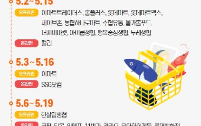해양수산부(장관 강도형)는 가정의 달 5월을 맞아 수산물 물가 부담을 완화하기 위해 다채로운 수산물 할인지원 행사를 개최한다. 먼저, 마트·온라인몰에서는 「대한민국 수산대전-가정의 달 특별전」을 개최한다. 이번 행사는 5월 2일(목)부터 19일(일)까지 진행되며, 소