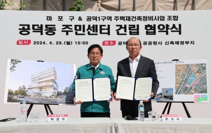 마포구 공덕동 주민센터가 공덕1구역 재건축정비사업 부지 내(아현동 418-6번지)로 이전해 오는 2026년까지 완공 예정이다. 마포구(구청장 박강수)는 공덕1구역 재건축정비조합과 수차례 실무협의를 거쳐 지난 3월 말 공덕1구역 조합총회가 동청사 부지 결정을 승인,