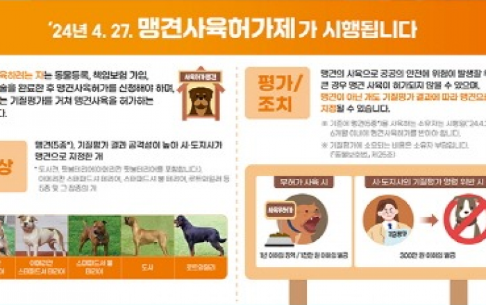 앞으로 맹견을 사육하려면 동물등록, 책임보험 가입, 중성화 수술을 완료한 후 맹견사육허가를 신청해야 한다. 현재 맹견을 기르고 있다면 오는 10월 26일까지 시장·도지사의 사육허가를 받아야 한다. 또 반려동물의 전문적인 행동교정, 훈련 등을 지도할 반려동물행동지도사 국