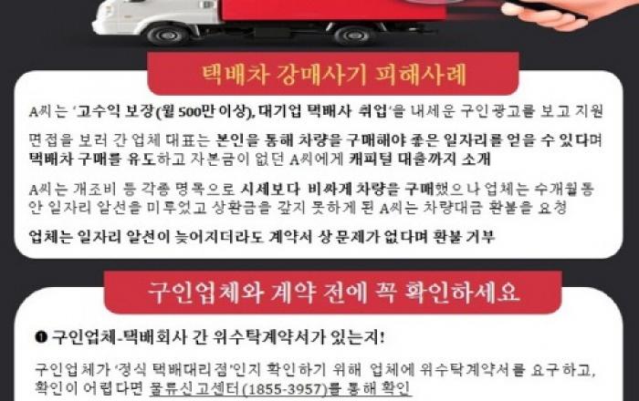 정부가 계약 전 필수 확인사항 안내, 구직자 교육 강화, 물류신고센터 사전 상담 등으로 ‘택배차 강매사기’ 예방에 나선다. 국토교통부는 택배업계에서 이뤄지고 있는 택배차 강매사기를 방지하기 위한 예방활동을 강화한다고 21일 밝혔다. 택배차 강매사기는 택배회사
