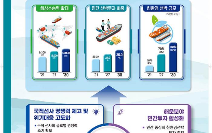 정부가 오는 2030년까지 해상수송력을 1억 4000만 톤으로 확충하고 국적 컨테이너 선사 선복량도 200만 TEU로 확대한다. 또 친환경 선박연료 인프라펀드를 포함해 해운산업 체질 개선에 3조 5000억 원을 추가 투자하기로 했다. 해양수산부는 이 같은 내용이