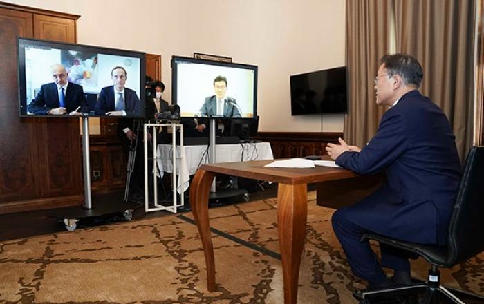 오스트리아를 국빈방문 중인 문재인 대통령은 15일 오전(현지시간) 비엔나에서 독일 제약사 큐어백사의 프란츠 베르너 하스 대표와 화상 면담을 갖고 한국과 큐어백사의 코로나19 백신 협력 강화를 당부했다.이날 면담에는 한국에서 권덕철 보건복지부 장관 및 큐어백사의 안토니