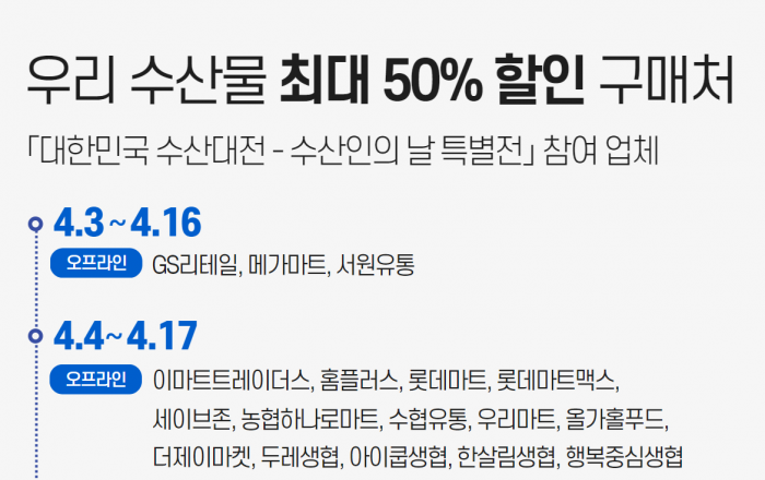국산 수산식품 구매 시 최대 50% 할인을, 전통시장에서 국산 수산물 구매 시 최대 2만 원까지 온누리상품권을 지급하는 행사가 4월에도 계속된다. 해양수산부는 수산물 물가 부담을 완화하기 위해 이달에도 ‘대한민국 수산대전-수산인의 날 특별전’과 ‘전통시장 온누