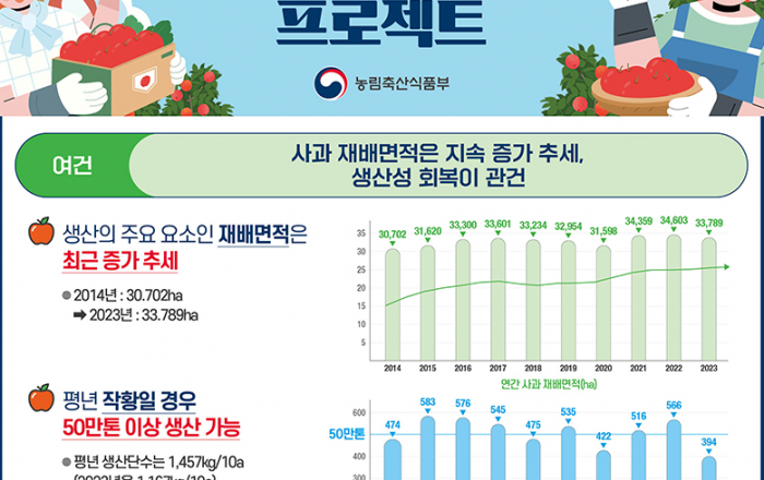 정부가 국내 생산 과일 중 소비 비중이 가장 큰 사과를 안정적으로 생산하고자 올해 ‘사과 안심 프로젝트’를 추진한다. 중장기적으론 기후 변화에 따른 재해 피해 증가 등의 영향이 커질 것에 대비해 재해예방시설을 확충하는 한편, 생산성이 2배 이상 높은