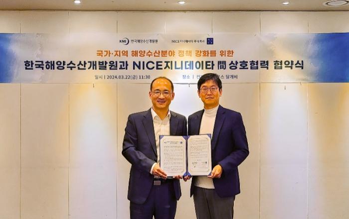 한국해양수산개발원(KMI, 원장 김종덕)은 3월 22일(금) NICE지니데이타㈜ (대표이사 김민수)와 ‘데이터 기반 해양수산 정책연구 수립’을 위한 업무협약을 체결하였다.이번 업무협약을 통해 ▲ 데이터 기반 해양·수산 정책 수립을 위한 분석 및 연구 수행 ▲ 해양․연안