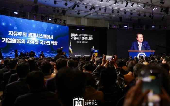 윤석열 대통령은 20일 오후 서울 여의도 63컨벤션센터에서 개최된 ‘제51회 상공의 날 기념식’ 행사에 참석해 우리나라 경제발전의 주역인 20만 상공인들의 노고를 격려했다. 윤 대통령은 ‘민간이 끌고 정부가 미는 역동경제’를 국정 목표 중 하나로 설정하고, 취