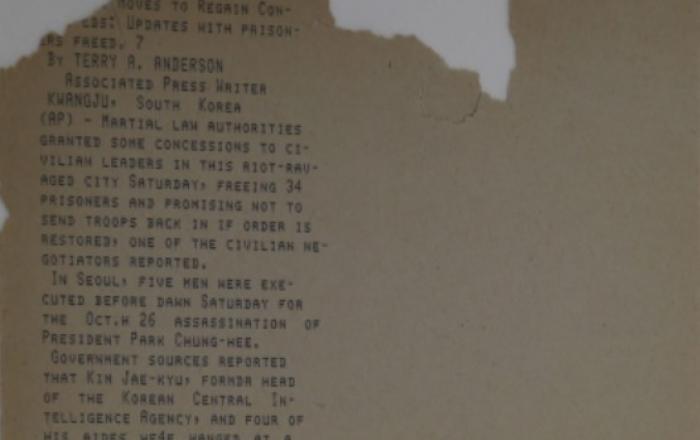 문화체육관광부 옛전남도청복원추진단(이하 추진단)은 5월 12일(화) 오전 11시, 옛 전남도청 별관 1층에서 기증식을 열고 오정묵(전 광주 문화방송 연출가, 현 오미디어넷 대표) 씨가 기증한 5·18 관련 자료를 최초로 공개한다. 이번에 공개하는 자료는 에이피(AP)