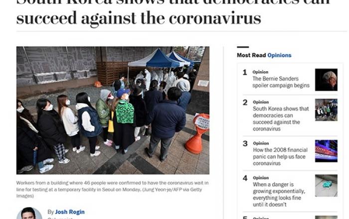한국이 민주주의 국가의 강점을 활용해 코로나19 위기에 성공적으로 대응하고 있다는 평가가 나왔다.미국 일간지 워싱턴포스트(WP)는 11일(현지시간) 코로나19를 둘러싼 글로벌 대응책을 다룬 논평 ‘코로나19에 맞서 민주주의가 성공할 수 있음을 보여준 한국(South K