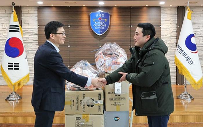 ▲ 인천세관 통관지원과 양을수 과장(왼쪽)이 한국사회복지협의회 산하 인천 푸드마켓 유현우 사회복지사에게 마스크를 전달하고 있다.관세청은 마스크 불법반출 집중단속을 통해 몰수한 보건 마스크 6000장을 한국사회복지협의회에 전달했다고 19일 밝혔다.이번에 전달된 마스크는