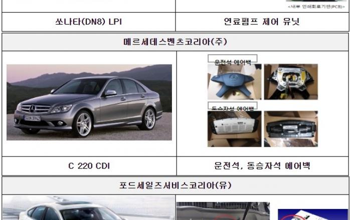 국토교통부는 현대자동차(주), 메르세데스-벤츠코리아(주), 포드세일즈서비스코리아(유)에서 수입 판매한 총 15개 차종 35,868대에서 제작결함이 발견되어 시정조치(리콜)한다고 밝혔다.첫째, 현대자동차(주)에서 제작, 판매한 쏘나타 12,902대는 연료펌프 제어 유닛*