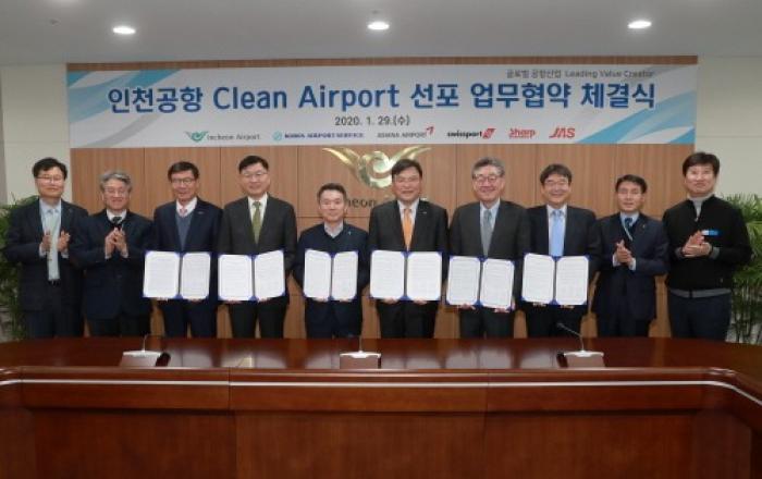 인천국제공항공사는 29일 공사 회의실에서 인천공항 5개 지상 조업사 대표들과 '공항 에어사이드 지역 온실가스 배출 ZERO 달성을 위한 Clean Airport 구현 업무협약'을 체결했다고 밝혔다.이날 체결식에는 인천공항공사 구본환 사장을 포함해 국내 5대 지상 조업사
