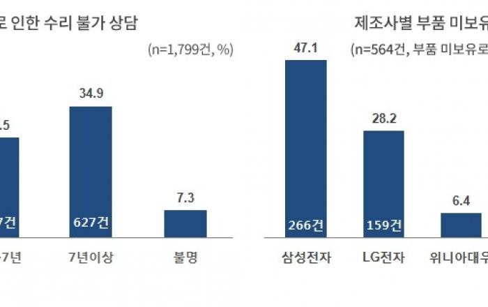 (사)소비자시민모임은 2018년부터 2019년 상반기까지 1372 상담센터로 접수된 TV, 냉장고, 김치냉장고, 세탁기, 에어컨 등 주요 가전 5개 품목의 상담을 분석한 결과, 제조사가 수리용 부품을 가지고 있지 않아 수리 받지 못해 접수된 상담이 1,799건으로 조사