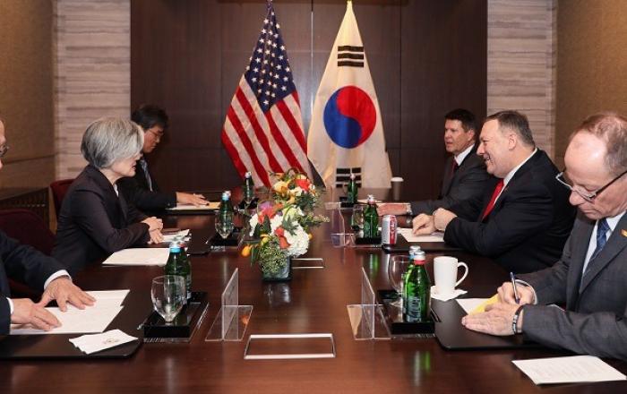 강경화 외교장관은 14일(현지시각) 미국 샌프란시스코 인근 팰로앨토의 포시즌 호텔에서 마이크 폼페이오 미국 국무장관과 회담을 갖고 한반도 정세 및 동맹 현안, 역내 및 최근 중동 정세 등 상호 관심사에 대해 협의했다.양 장관은 현재 한반도 문제 관련 상황 평가를 공유하