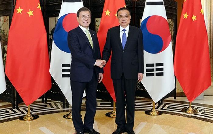제8차 한일중 정상회의 참석차 중국을 방문 중인 문재인 대통령은 23일 오후(현지시간) 리커창 중국 총리와 회담 및 만찬을 갖고 한일중 3국간 협력 및 한중 간 경제·통상·환경·문화 등 실질 분야 협력 제고 방안 등 상호 관심사에 대해 심도 있게 협의했다고 청와대가 밝