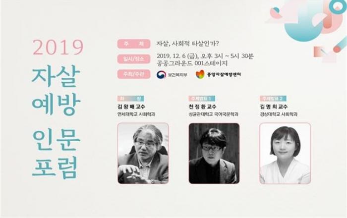 보건복지부와 중앙자살예방센터는 12월 6일(금) 오후 3시 서울 종로구 공공그라운드에서 ‘2019 자살예방 인문공개토론회(포럼)’를 개최하였다.‘자살예방 인문포럼’은 자살예방 국가 행동계획(’18.1)에 따라 사회적 관점에서 자살문제를 검토하고, 자살 관련 인문학 연구