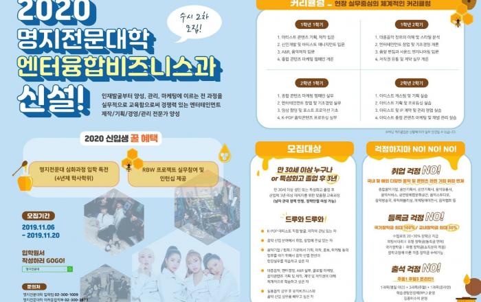 ‘믿고 듣는’ 마마무와 ‘월드 클래스’ 신인 원어스를 키워낸 ㈜알비더블유(이하 RBW)가 참여한 명지전문대학 ‘엔터융합비즈니스과’가 2020학년 신입생 수시모집을 시작했다.2020년 신설되는 ‘엔터융합비즈니스과’는 기존의 K-POP을 가르치는 교육이 아닌 음악, 영상