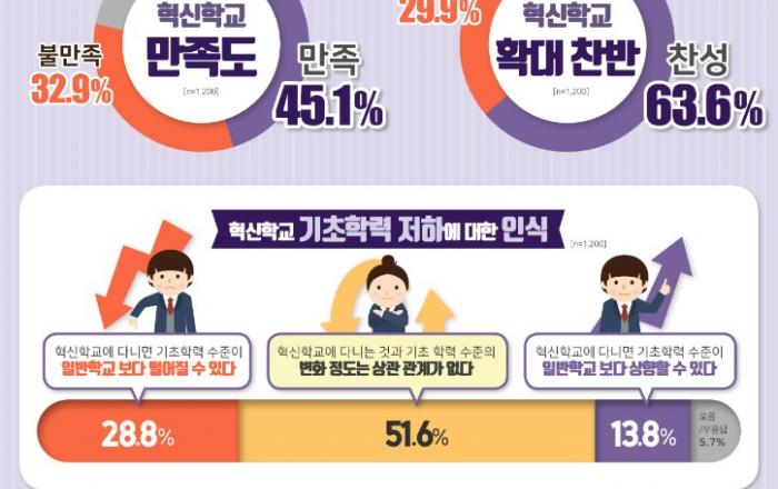 경기도교육청이 실시한 여론조사에서 경기도민 10명 중 6명(63.6%)은‘혁신학교 확대’에 찬성하는 것으로 나타났다.2009년부터 시작해서 올해로 10년째 접어드는 혁신학교의 성과에 대해 도민들은 ‘다양하고 특색 있는 교육 모델 제공’(34.1%), ‘학교 교육 자율성