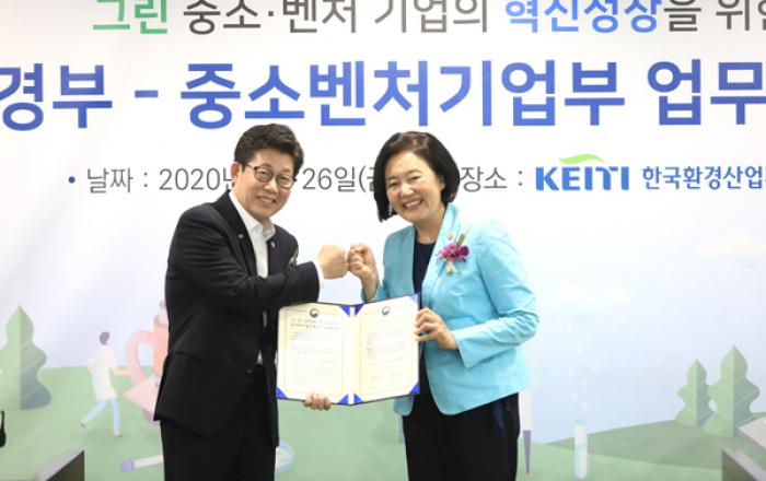 환경부와 중소벤처기업부는 6월 26일 오전 서울 은평구 한국환경산업기술원에서 '그린뉴딜' 대책을 상호 협력하여 효율적으로 추진하고, 그린 중소·벤처기업의 혁신성장을 공동 지원하기 위한 업무협약을 체결했다.양 부처는 사회 전 분야의 녹색전환과 우리 경제의 신성장 동력으로