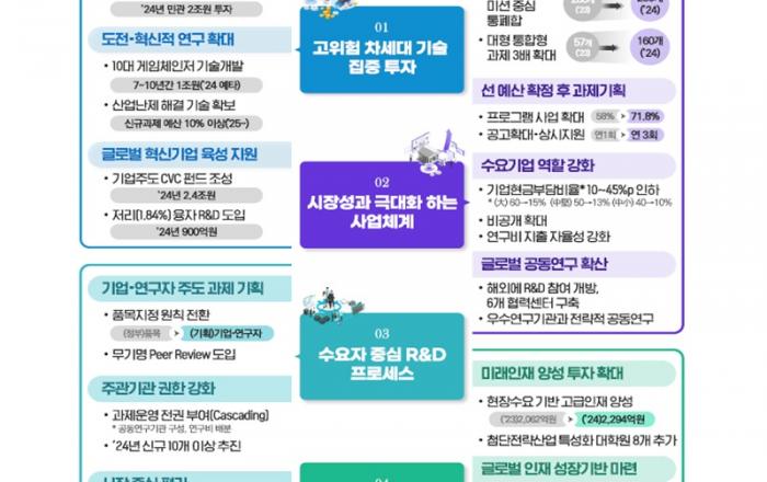 앞으로 산업·에너지 기술개발(R&D)에 대한 정부 투자가 고위험·차세대·대형 과제 중심으로 재편된다. 또 대형과제에 참여하는 기업 등의 현금부담이 대폭 완화되는 한편, 기업과 연구자가 과제 기획과 운영의 전권을 행사하는 수요자 중심의 프로세스로 전환된다.