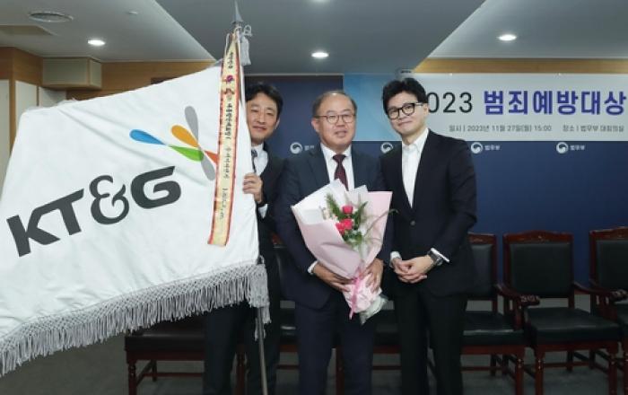 KT&G가 지난 27일 과천정부청사에서 열린 '2023 범죄예방대상' 시상식에서 대통령 표창을 수상했다. 법무부가 주관하는 이번 시상식은 대한민국 법질서 확립과 발전에 기여한 기관 및 개인을 포상하는 자리로 마련됐으며, 올해 수상 단체 중 민간기업은 KT&G가 유일