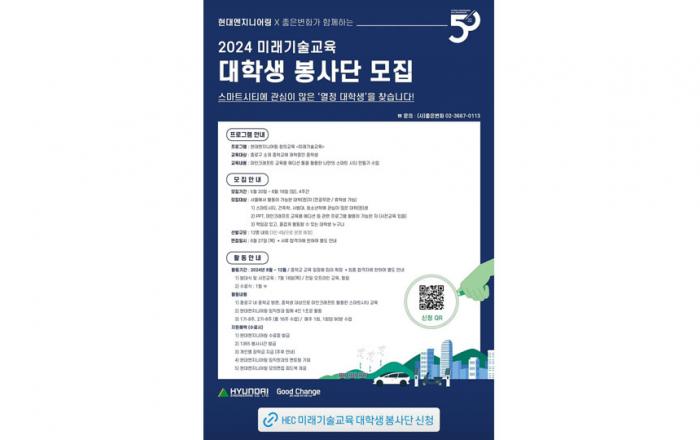 현대엔지니어링이 ‘2024 미래기술교육 대학생 봉사단’을 모집한다고 5일(수) 밝혔다. ‘2024 미래기술교육 대학생 봉사단’은 현대엔지니어링이 종로구 소재 중학생에게 스마트시티와 스마트건설기술 등 건설업에 대한 이해 및 건설업과 관련된 폭넓은 진로탐색의