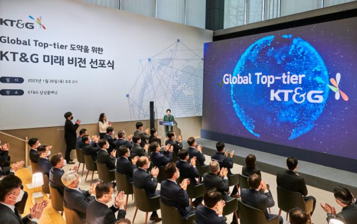 KT&G가 26일 ‘KT&G 미래 비전 선포식’을 열고 글로벌 ‘톱 티어(Top-Tier)’ 기업으로의 도약을 위한 그룹 목표와 청사진을 공개했다. KT&G 상상플래닛에서 진행된 이날 행사에서 백복인 사장은 ‘2027 KT&G 비전’을 공개
